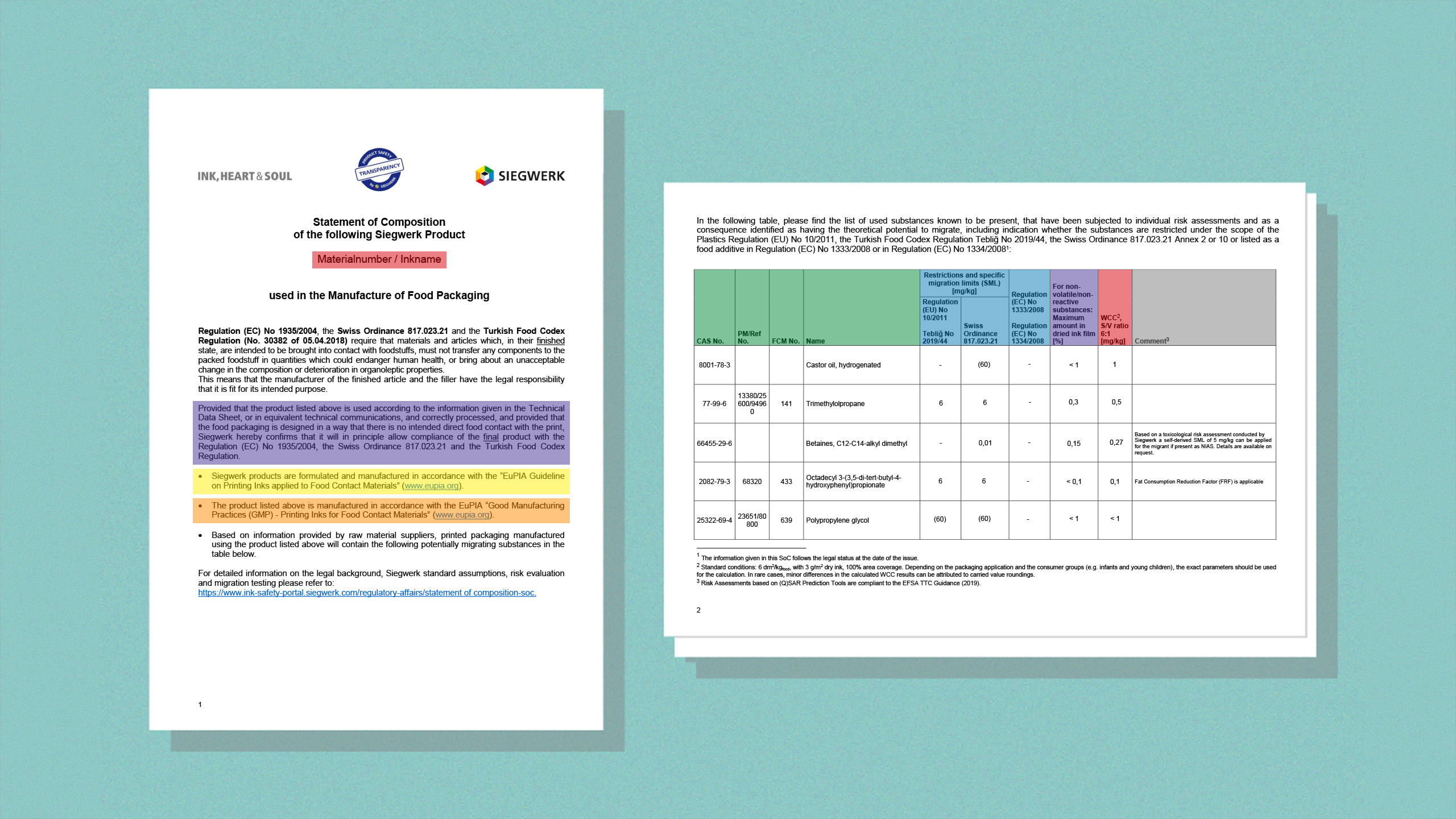 For an overview about the potentially migrating substances and their listing status in the above mentioned regulations of the different regions, a global template of Siegwerk’s Statement of Composition is available on request.