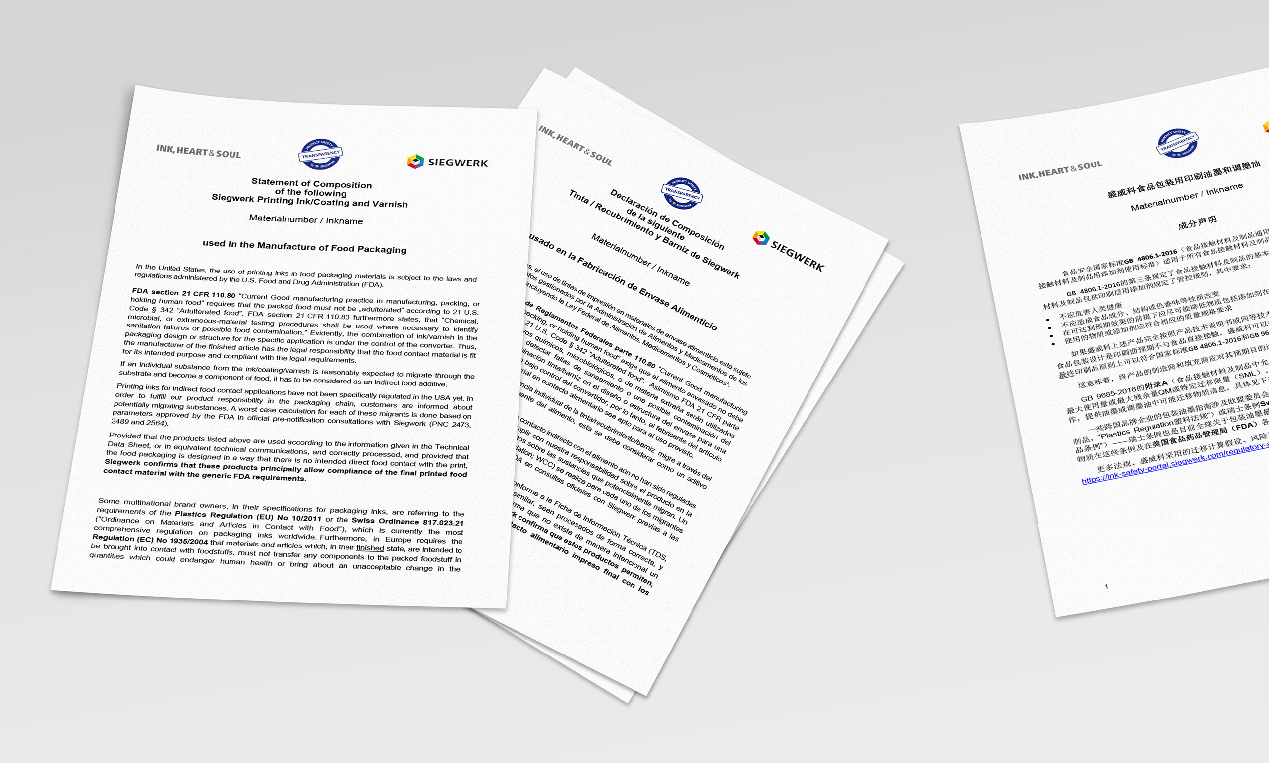 For an overview about the potentially migrating substances and their listing status in the above mentioned regulations of the different regions, a global template of Siegwerk’s Statement of Composition is available on request.