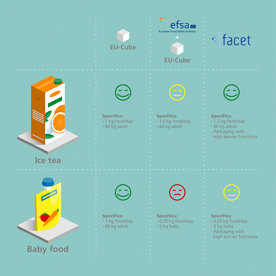 The graphic shows that different packaging designs with regard to size, ink coverage and/or weight of the packed food can lead to different migration values for a certain migrant into the food compared to the corresponding SML (shown here by Smileys).