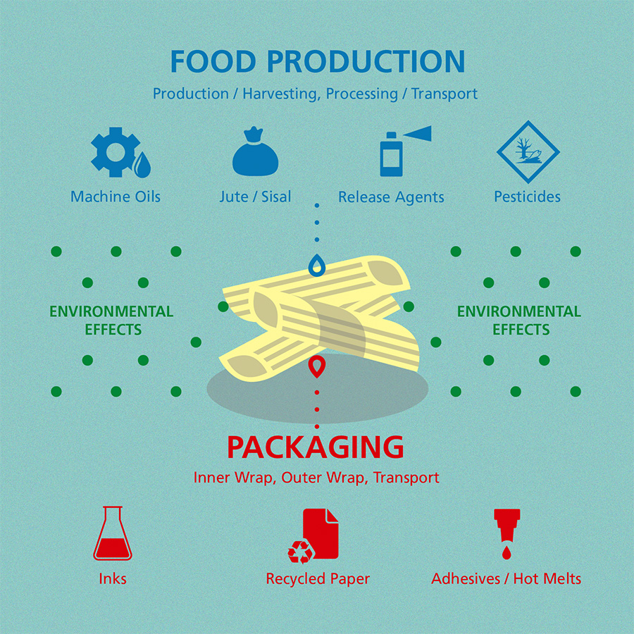 The contamination of foodstuff by packaging is mostly caused by the usage of recycled paper or cardboard, which can have high amounts of MOHs, mainly originating from mineral-oil-based, non-food grade newspaper inks. The strongest contamination will take place if the primary food packaging itself is made of recycled paper. Other sources could be, for example, directly on the packaging printed MOH containing inks or the use of corresponding adhesives/Hot melts.
