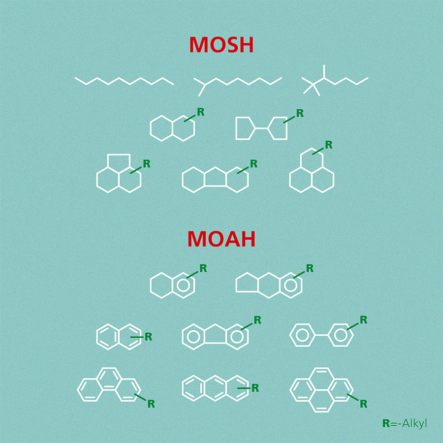 The problem with mineral oils is their harmful effect on human health. Some Mineral Oil Saturated Hydrocarbons (MOSH) can accumulate in the organism and some Mineral Oil Aromatic Hydrocarbons (MOAH) are potential genotoxic carcinogens.